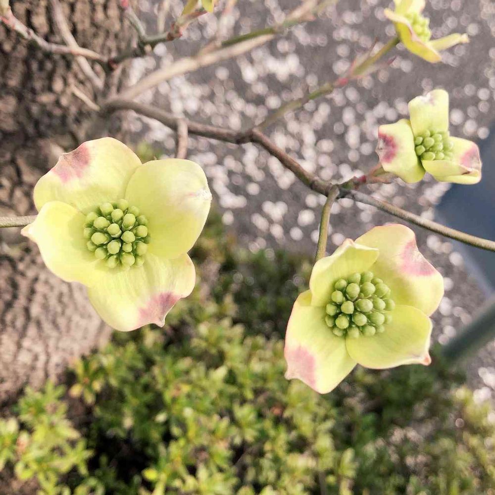 まだ葉もないですし、蕾(ガク)が開いて間もない小さなハナミズキと思って載せていましたが、今日@たつみさんに、ヤマボウシではないかとお聞きしました。自宅の木ではないので、ハッキリ分からなくてすみません💦落葉樹のヤマボウシもあるとの事です。