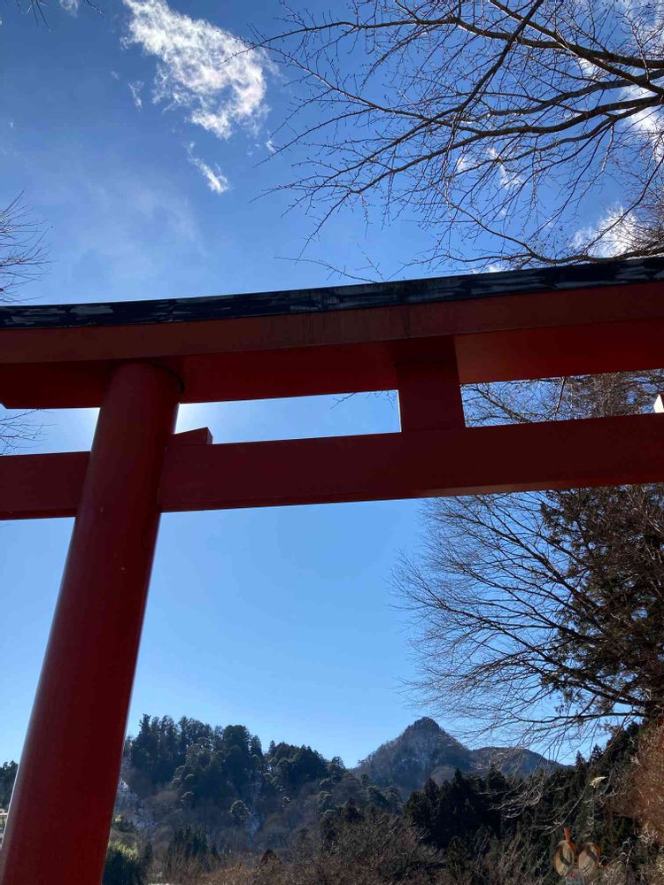 赤い鳥居⛩と雲、真っ青な空、見上げると、元気が出ますね。