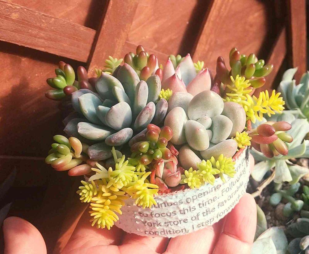 ブルーアップル、フレーベル、シルエット×ダークアイス、虹の玉、セダム(黄色)、不明多肉です💡