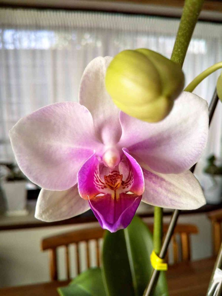 窓辺の胡蝶蘭たち、蕾がここ2日ぐらいの暖かさで急に膨らみ、ミニ胡蝶蘭が最初の開花です💕