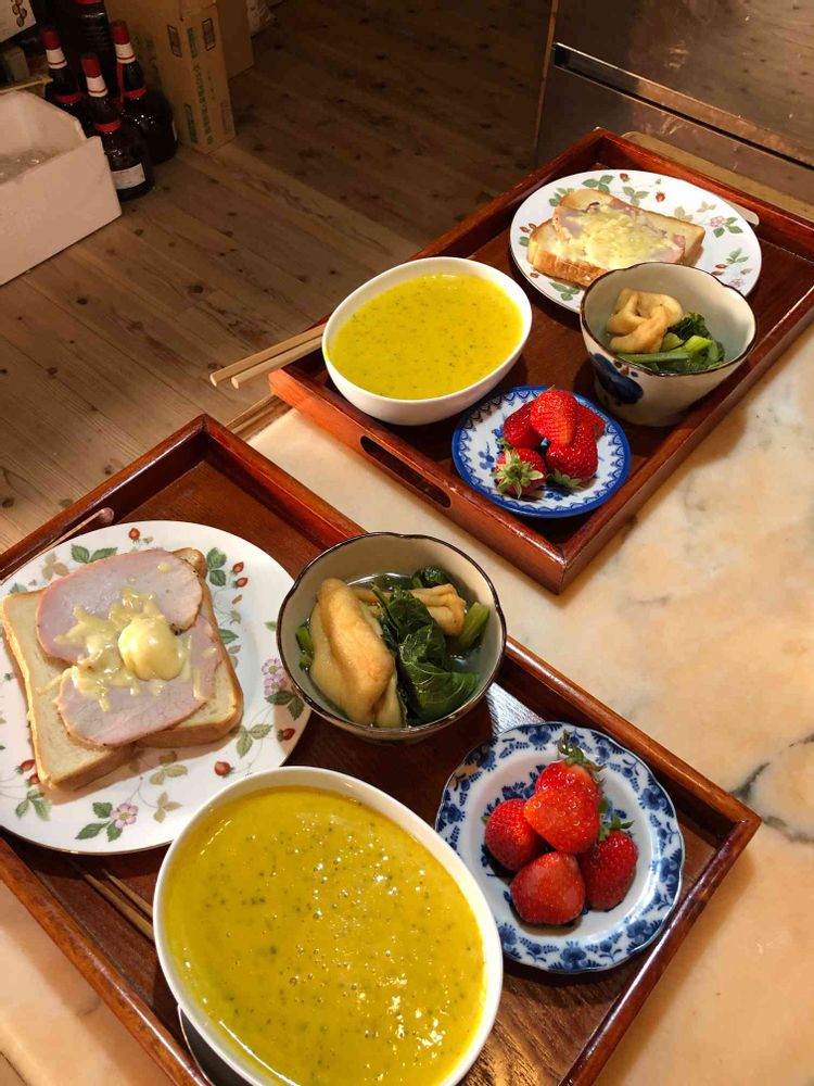 すえすえさんのカボチャポタージュ,苺、,薄揚げ、熊本京菜煮浸しの投稿画像