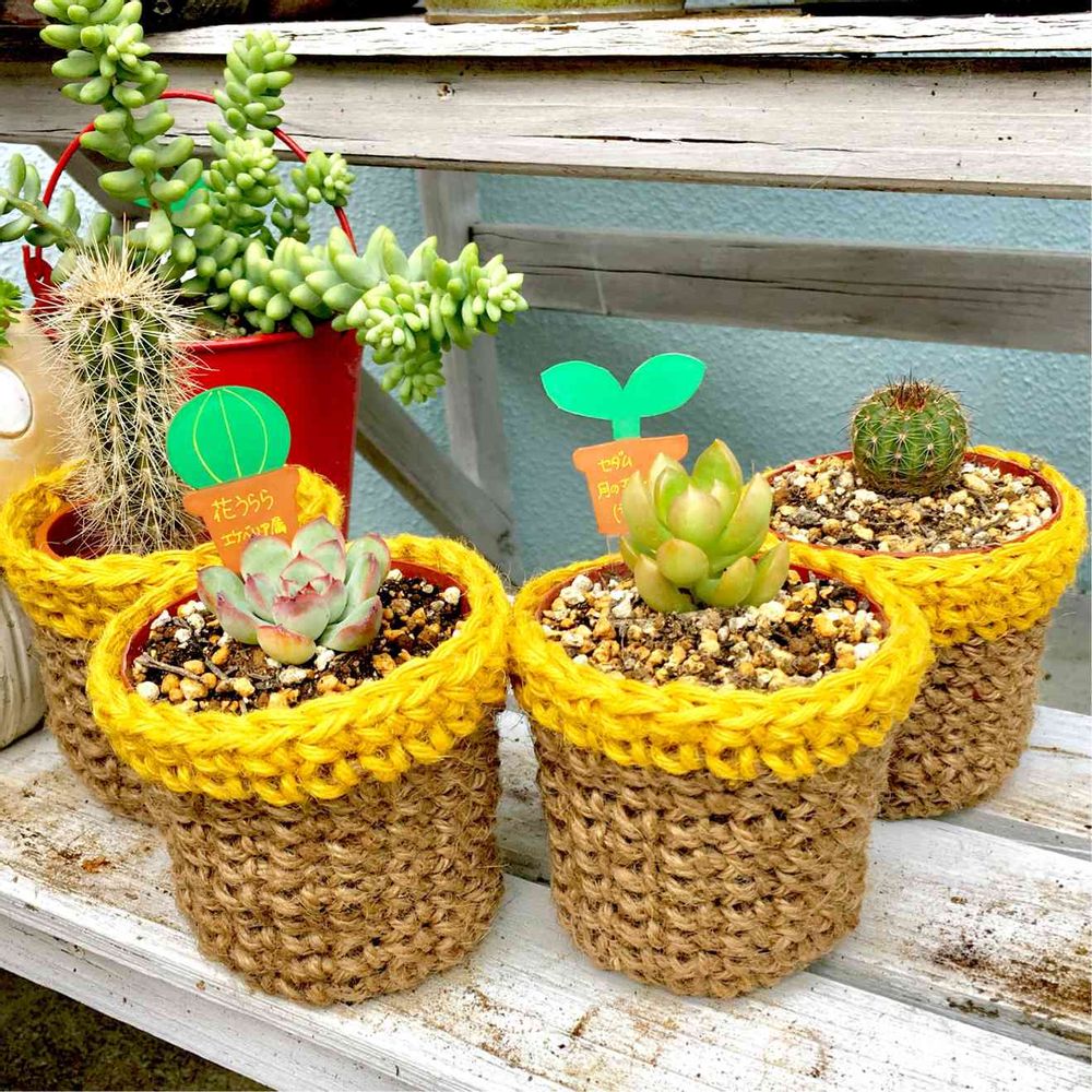 寄せ植えでない、個室の方たちに、カバーを麻ひもで編んでみた☝️