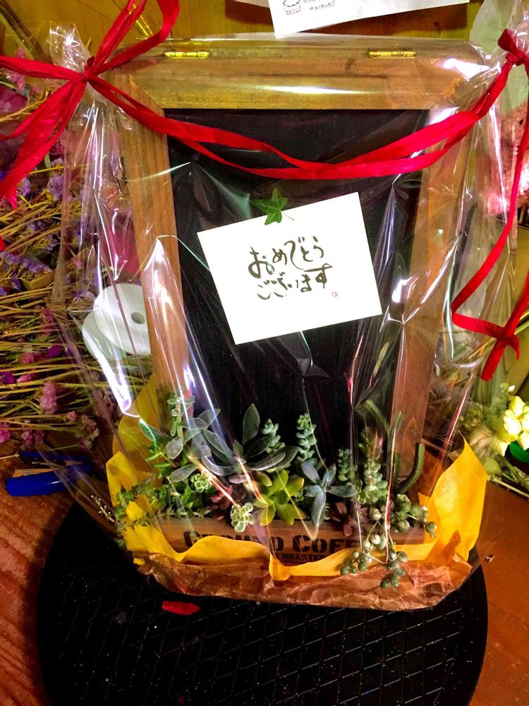 お客様が選ばれたブラックボード付きのカフェ看板のようなモノの下部に付いている木箱部分に、多肉の寄せ植えをしました✌︎('ω')✌︎