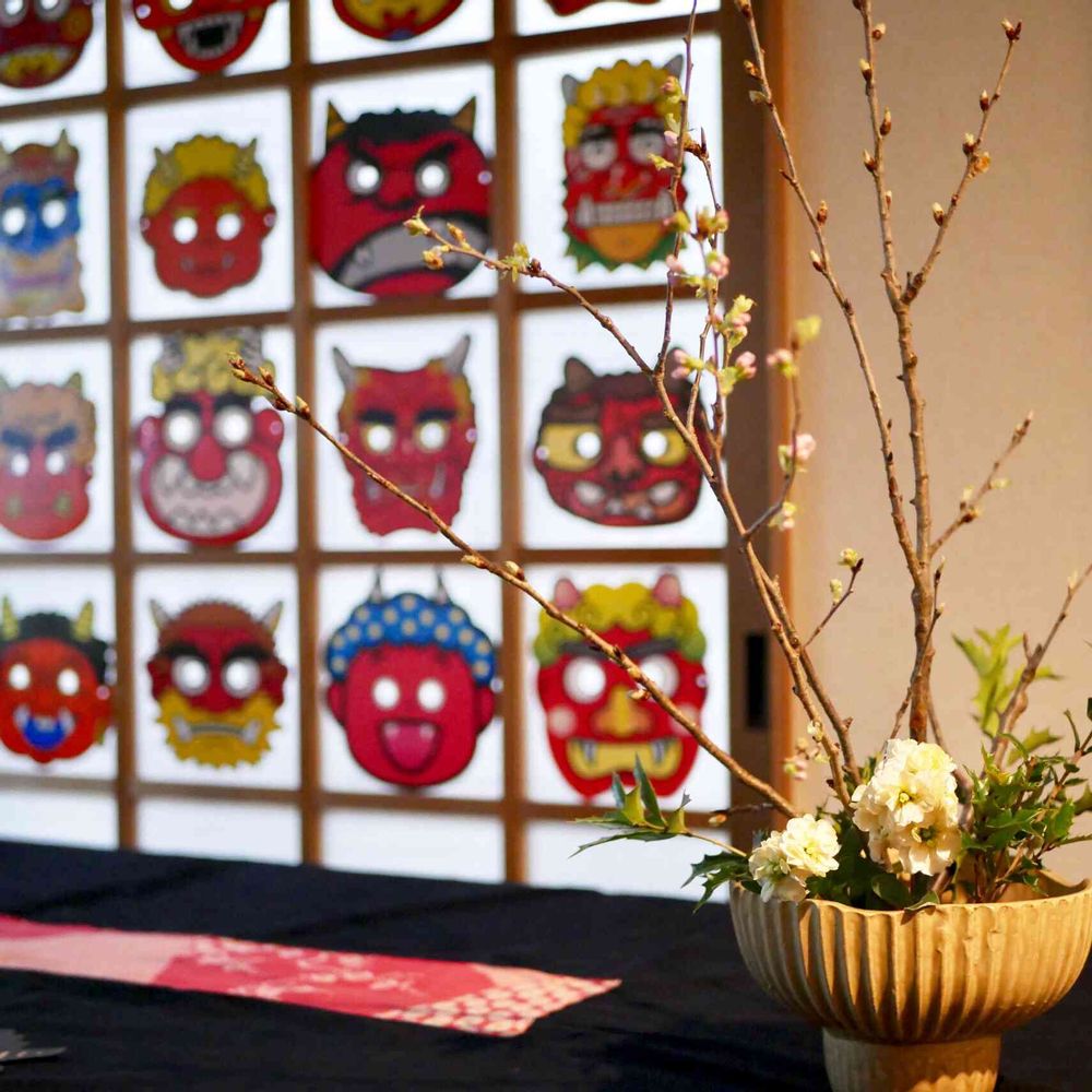 可愛いバックスクリーンはどうなっているのかなと思ったら、お面なんですねー👀素敵な演出ですね😍お花もきれいに活けてあって福も、良い鬼さんも喜んで入ってきそう😃