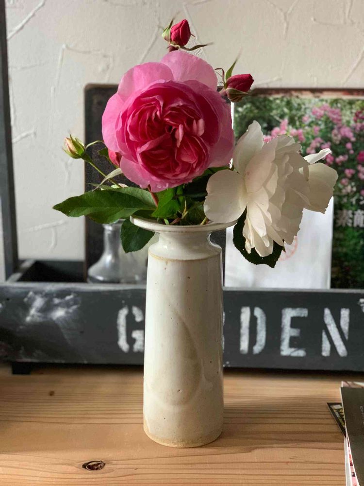 バラ🌹ヘリテージとアイスバーグ 花瓶に入れて飾るのも綺麗ですねー 外は寒いので 家の中の方が バラ🌹も 嬉しいかも、、