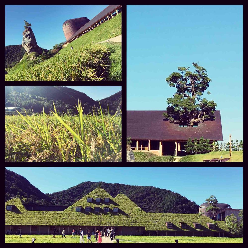 屋根一面が芝生におおわれ下が店舗になっていて広々とした吹き抜けの空間に和洋菓子🍡🍰🍩の売場が並んでいました。店舗の奥にはまさかの田んぼがー!!😵