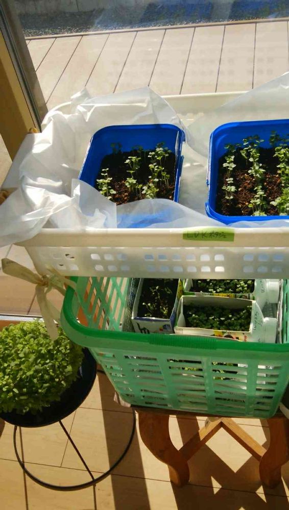 下のかごには ザバスのパックに 美味タスや、ルッコラを撒きましたョ