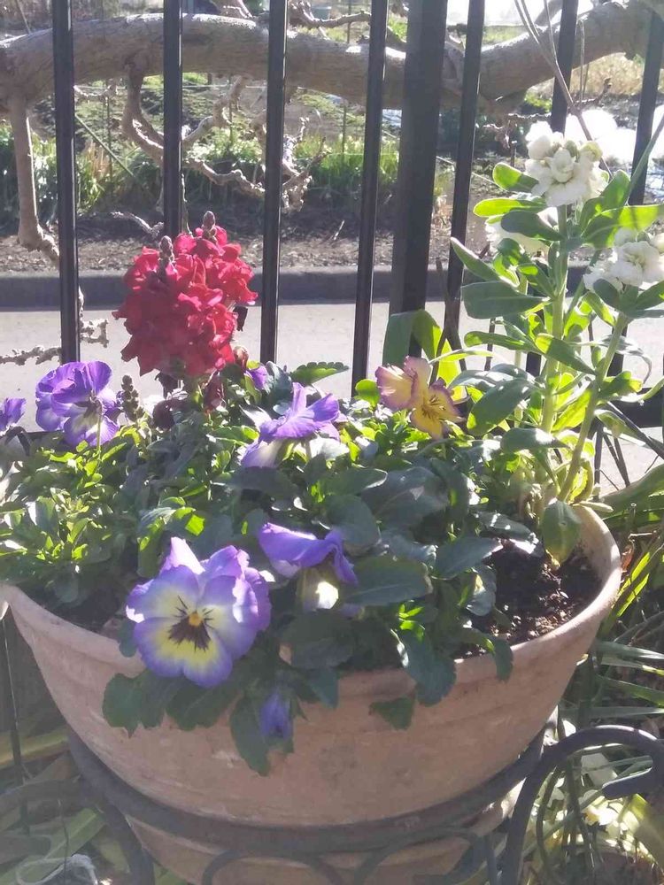 パンジーの間に赤い金魚そうを後から足しましたが、どうやら根付いてくれた様です❤️花芽が付いた枝が出て来てます‼️🤗💞🎶