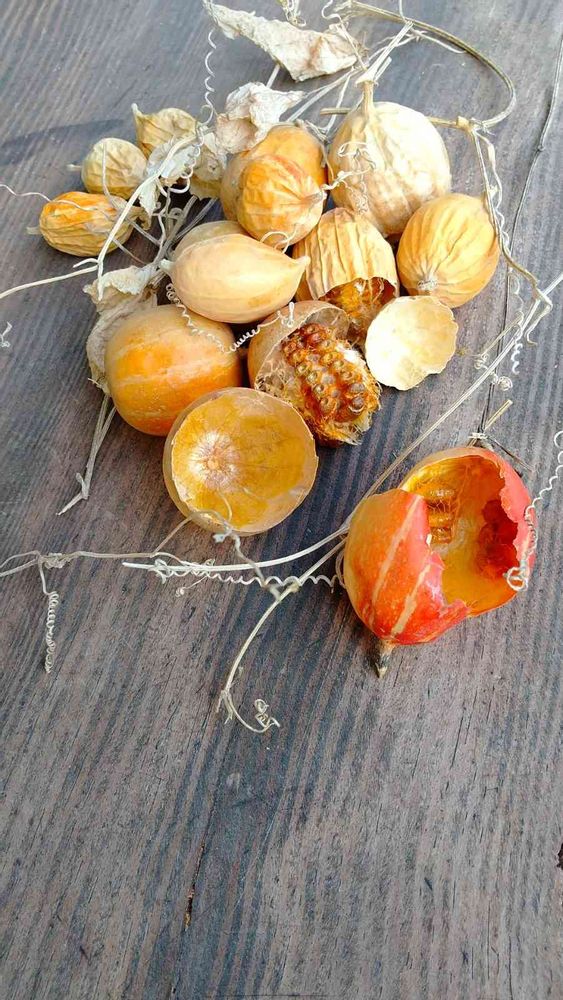 秋から自然乾燥させていたカラスウリを開けてみました。🌽とうもろこしみたいに種がぎっしり!