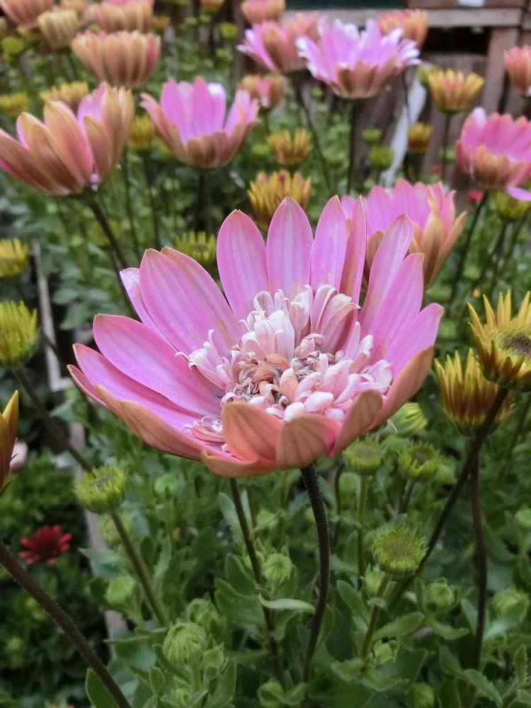 オステオスペルマムにはカラフルな色合いや様々な花形がありますが、このラグールは大輪で八重咲きです。