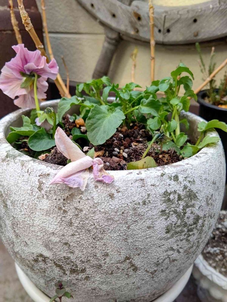 青カビが少しあり。保存の仕方が悪かったためにブヨブヨとしており、手術をしたのが芽が出ている2個。パンジーは根が回りすぎて、根鉢を崩そうとしたら全ての根が取れてバラバラになってしまった為に挿し木状態。日陰にて様子を見ることに。