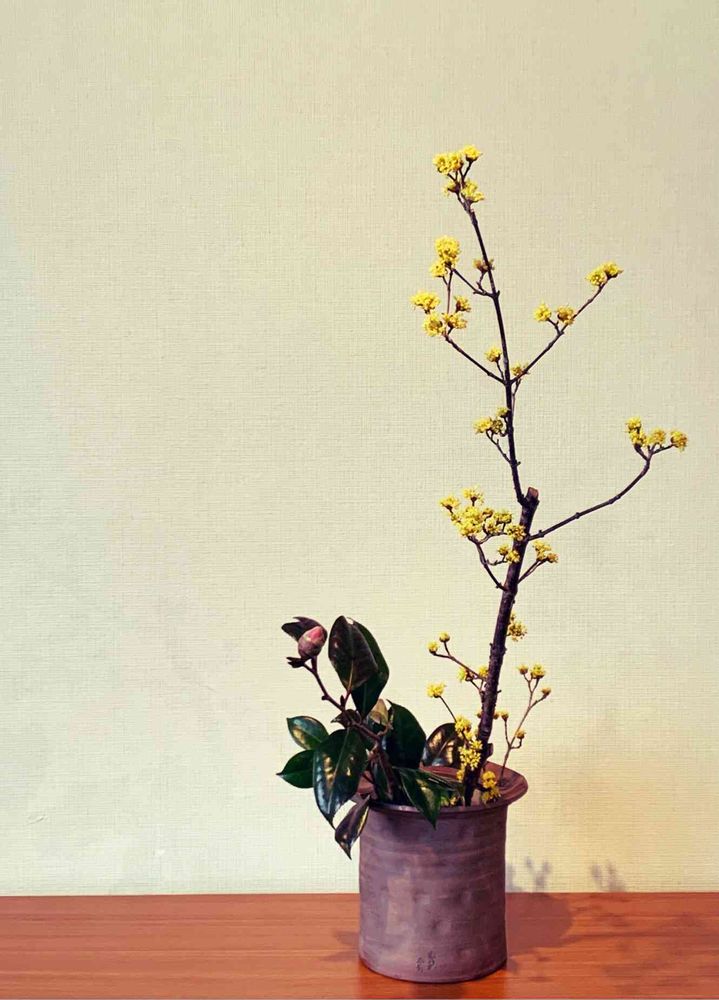流派本来であれば椿は一種生けだそうですが、今回は山茱萸と合わせてのお稽古でした。