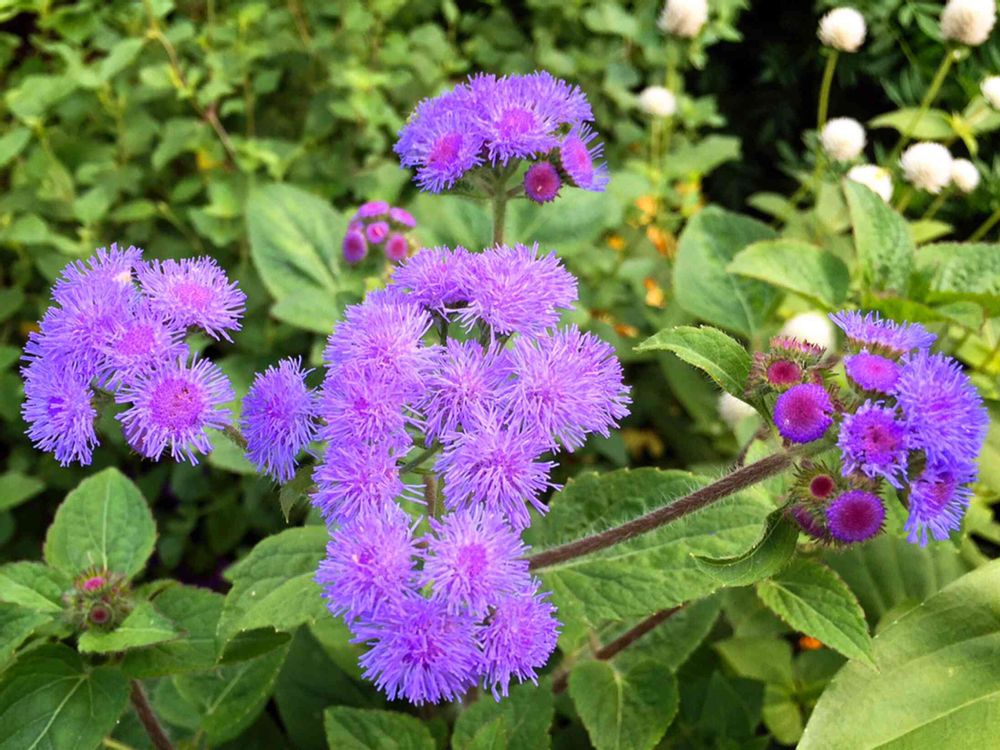 鮮やかな緑色の葉の茂る茎の先端に、アザミに似たふわふわでポンポンのような可愛らしい花がまとまって咲くアゲラタム💜
