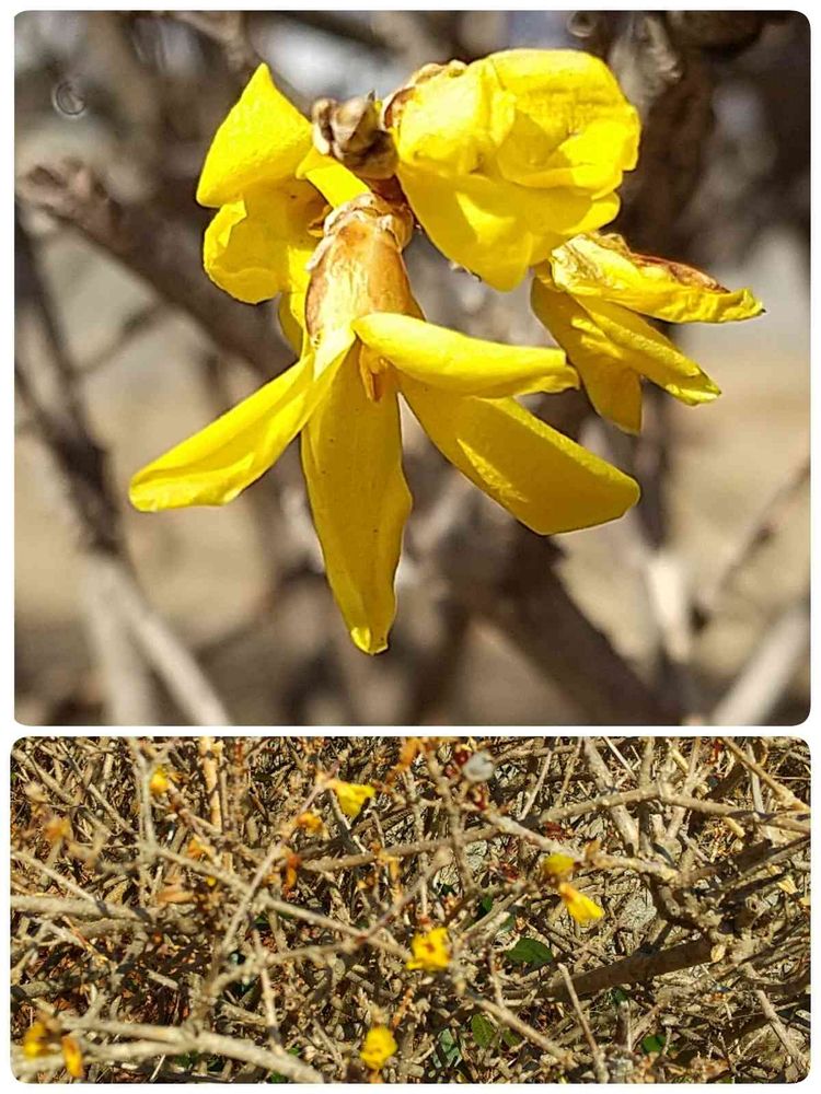 葉っぱのない枯れ木のようなとこに、黄色の花がポツポツと咲いていました。