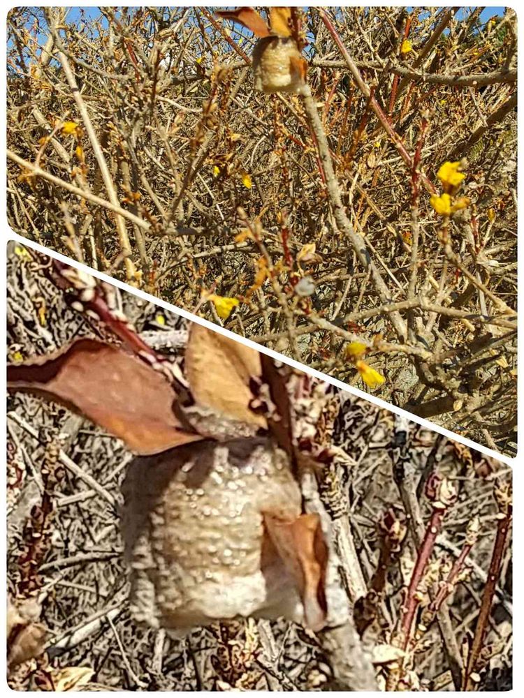 レンギョウの木に、何か付いていました。