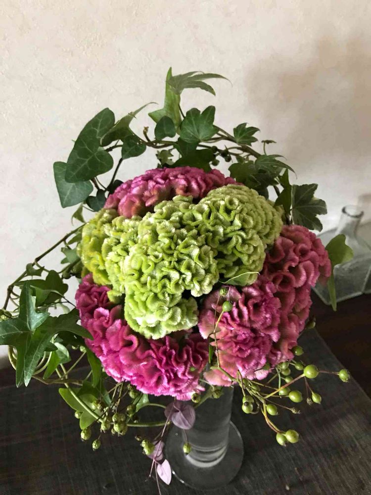今年はケイトウ 色んな色が出回ってました(GS インスタなど) オレンジ色はストアーにも置いてありましたが …グリーンは お花屋さんでゲットしました🍀🍀