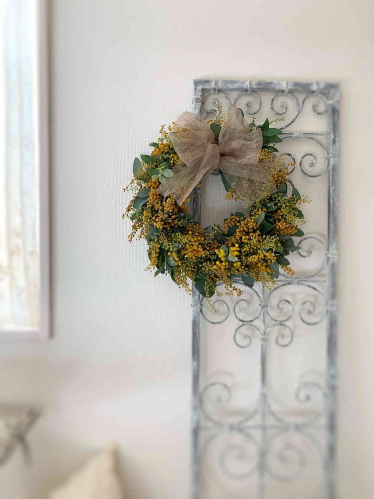 このリースのミモザは銀葉とパールです。丸く見えるのはパールかも。