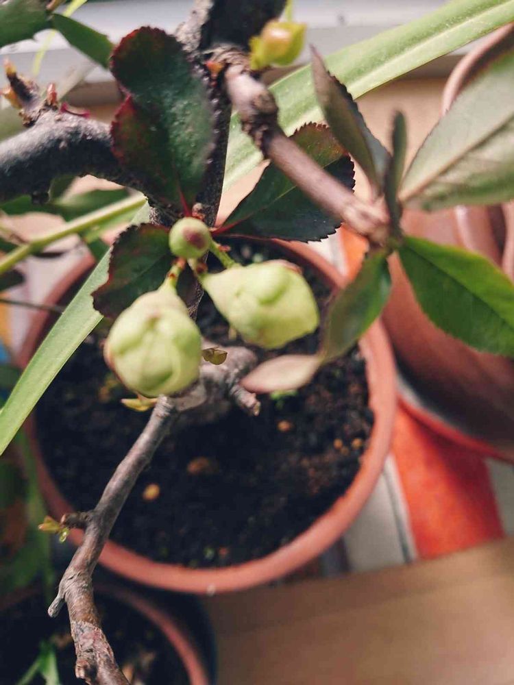 父の盆栽 ボケの蕾が膨らんできました!
