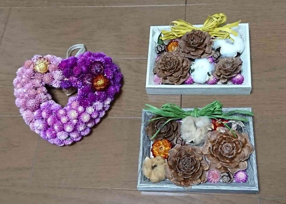 100均の枠に畑で採れた千日紅や綿をつけてみました😊