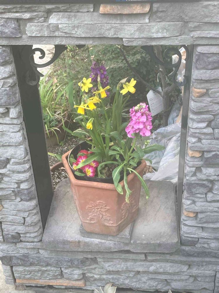 お出かけ先,黄色の水仙,八重咲きストックの投稿画像