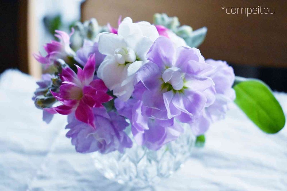 綺麗な色のストックとピンクのスプレーカーネーションを思い切って短く分けて小さくアレンジにしてみました。器はダイソーのキャンドルフォルダーです。