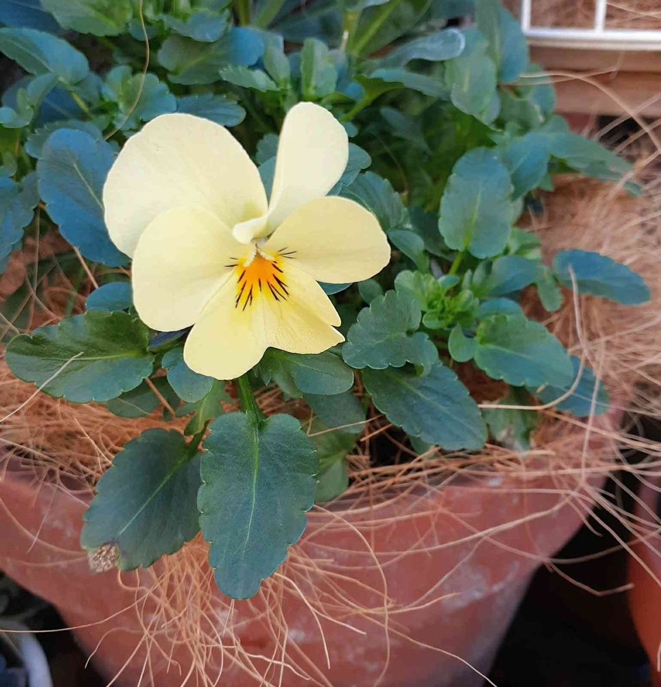 まだまだ、小さな姿の我が家のビオラ花びらの模様がラインを引いたみたい😊シンプルな姿ですが、可愛らしいです。