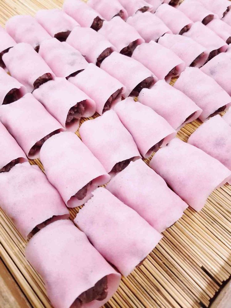 こちらでは🌸桜色の餅米?(粒々あり)で餡を包んであって、更に塩漬けした桜の🍃が巻かれています😋💕