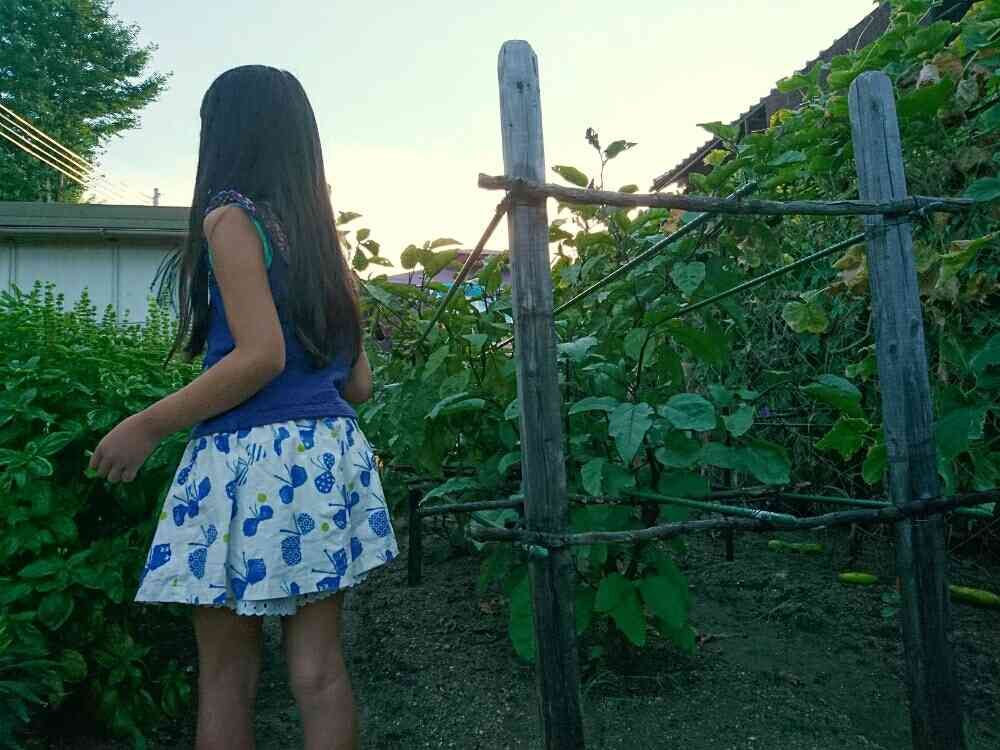おばあちゃん家の茄子畑で茄子色の服を着た娘の後ろ姿…