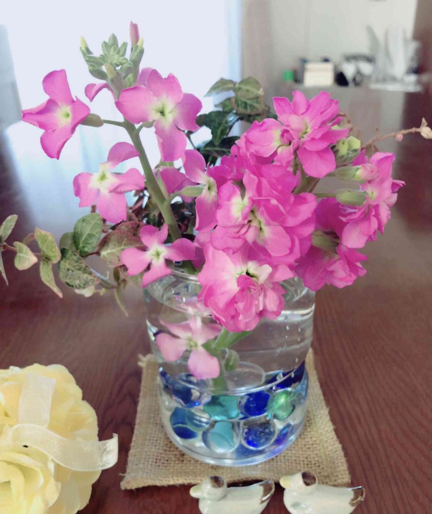 ビー玉は前によく使ってたけど、この頃花瓶に入れずに飾ってたのを入れてみました😊 箸置き可愛いでしょう〜フラワーアレンジをくださった方が皿やこの箸置きもくださったんです、私も気に入ってます💓