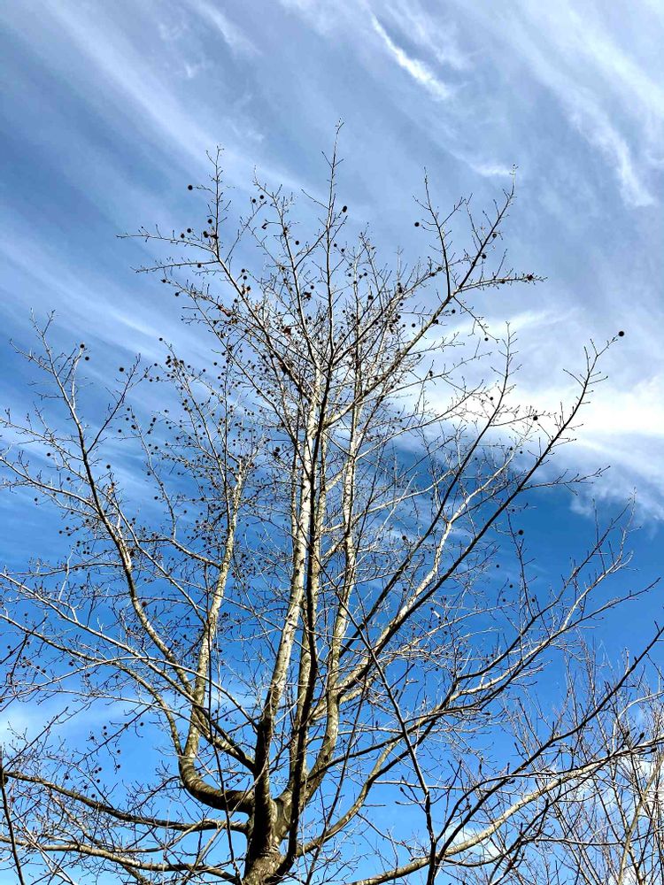 青空に映えるタイワンフウの枝と実を撮ろうとしてたら雲が丁度こんな風になってたので、雲仲間チャンスは今‼︎シャッターポチッと…💙