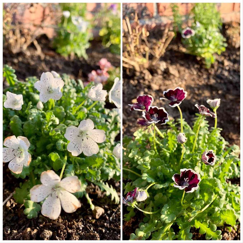 ネモフィラの左(アトマリア)と右(ペニーブラック)を庭に植えました。