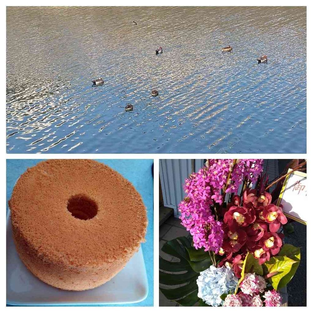 昨日シフォンケーキを焼いて 散歩に川に🦆泳いでて お店の前にお花が飾られてました🎶