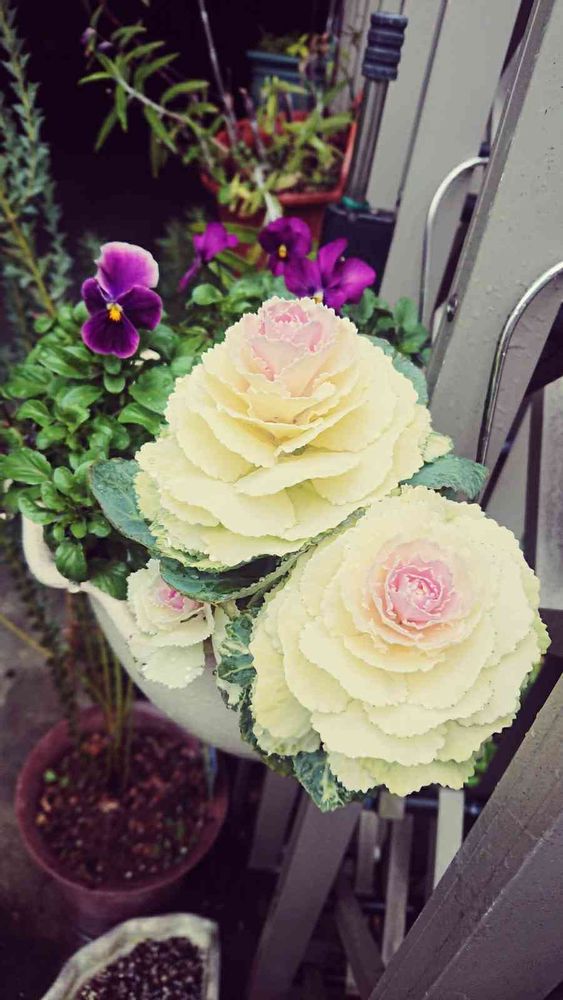 ビオラと一緒に植え直しました。だけど葉牡丹ばかりこんもりと盛り上がり、白くて真ん中がほんのりピンクで、ケーキ🎂みたいで美味しそう~😋