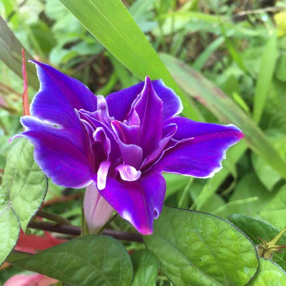 桔梗咲き、八重の朝顔を初めて見た。地べたを這っていて、野生化していた。紅桔梗色と竜胆色の混色で、なんとも味わい深い。思わね拾い物をしたようで、変顔を朝顔に返してあげた。