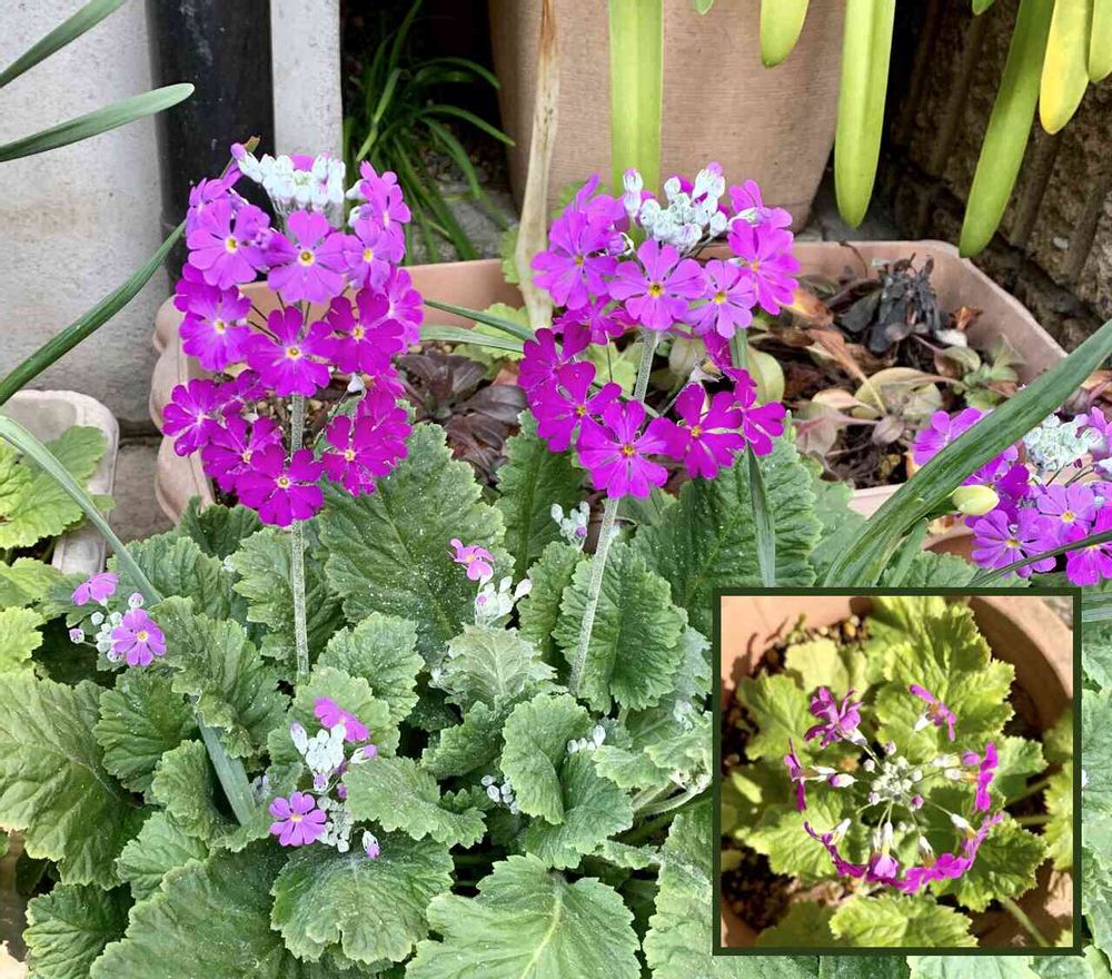 ---風が強く寒さが一際感じられる中での散布道。その道際のあるお宅の玄関先に置かれた、幾つかの花鉢のひとつの小綺麗置かれた鉢の中に、早くも紅紫の桜草、1段、2段そして3段の3つのクリンソウが、肩を並べるようにそこに初々しくも賑やかにしていた。