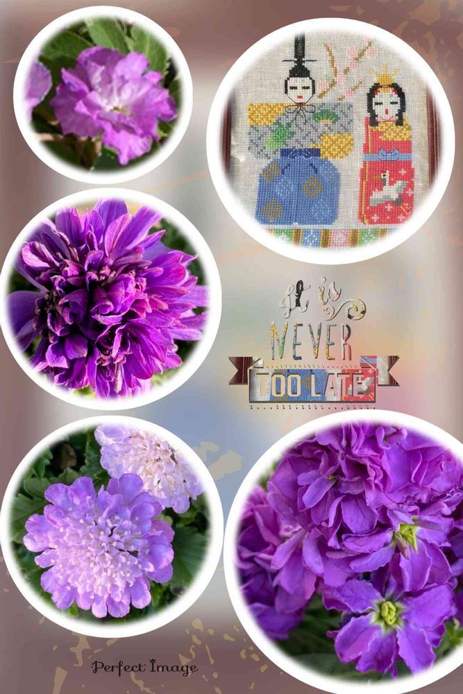 美しい紫色のお花さん達と素晴らしいお雛様の刺繍とても素敵ですね🤗
