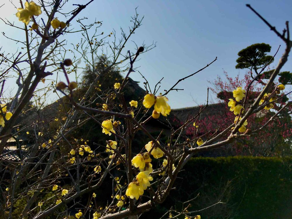 戸島氏邸・庭園で綺麗に咲いてるロウバイを発見❗️その奥には紅梅も咲いていました‼️