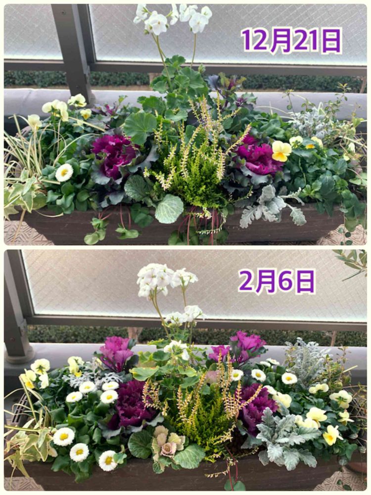 寒い時期なので全体の形はあまり変わらずコンパクト。デイジーとビオラは次々と咲いています。カルーナはほとんど変わらず。手前のオキザリスは植え付け時に根を崩してしまいぐったりしたまま。球根から芽が出ているので復活を気長に待っています。ゼラニウムは次々と咲き、花持ちもいいので冬場にはとてもありがたいお花です。