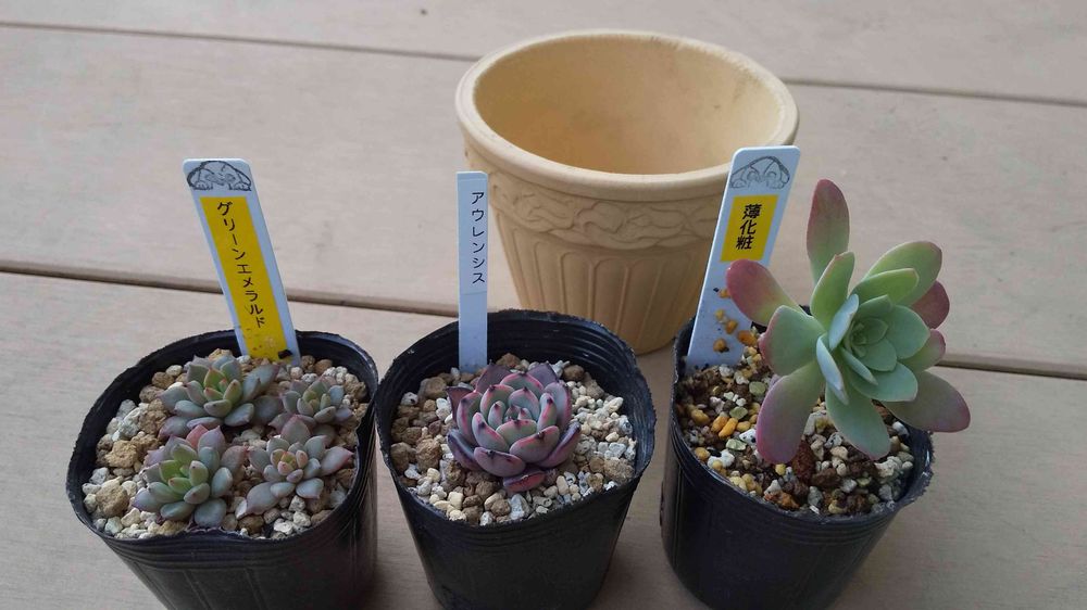 去年狩ってた名無し一寸ポットの子が3つと葉挿しトレーのいいサイズになった子たちがいるので合わせて寄せ植え作ろ🎵