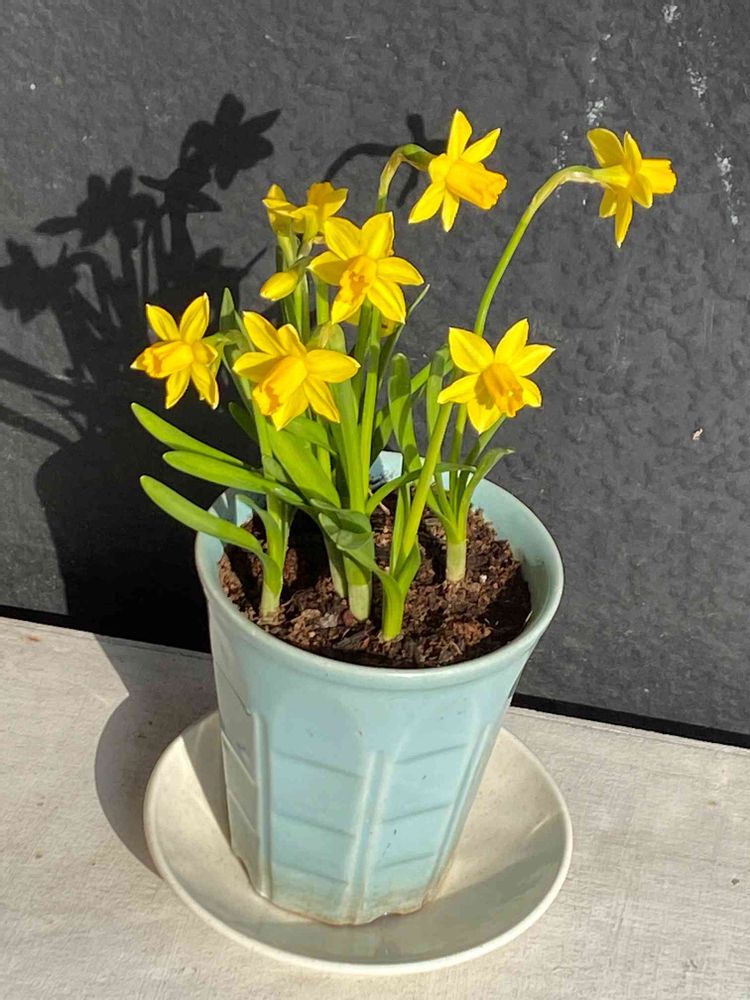 ミニ水仙の黄色いが元気いっぱいです✨地植えしようと思っていたけれど、お気に入りの植木鉢に植えちゃいました。少し水栽培にも😊