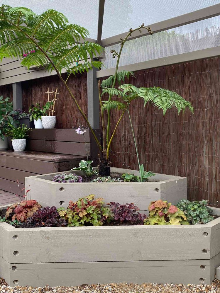 ディクソニアに替わって植えたレーシーツリーファーンとホスタの茎がぐんぐん伸びてます☘️