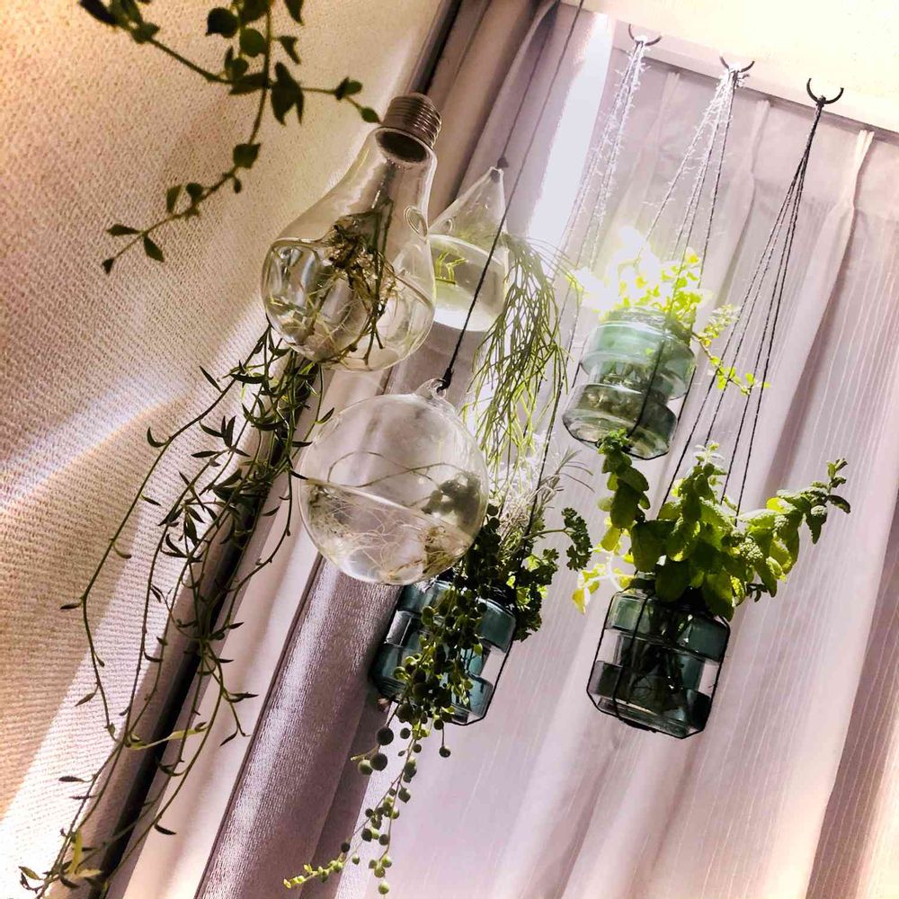 お気に入りフラワーベース、第7弾は天井から吊るしているハンギングガラスポットです。