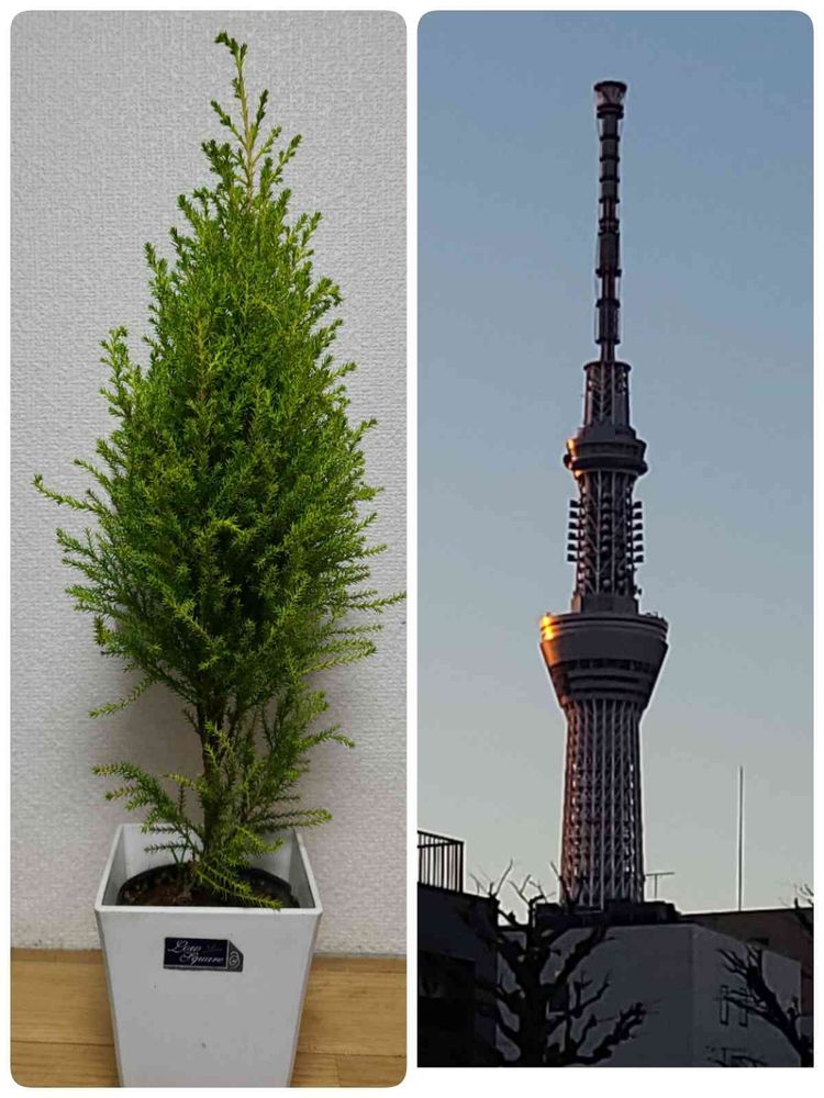 朝陽に輝いたスカイツリー素敵ですね💕コニファーちゃん負けてないです😁✨✨