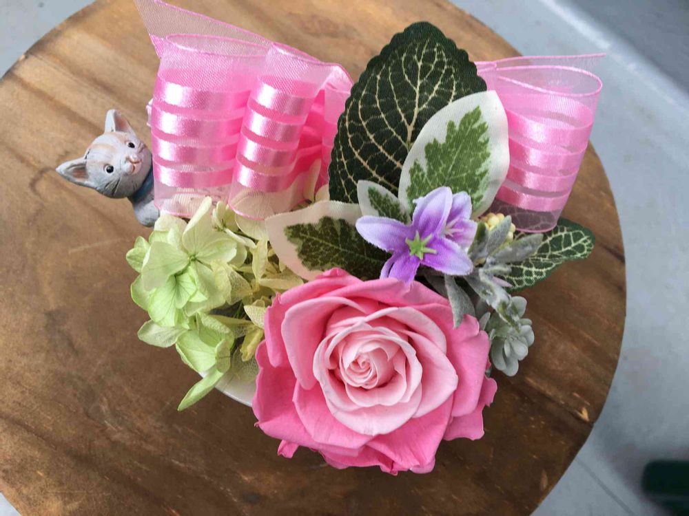 とってもかわいいピンクの猫ちゃんアレンジ。