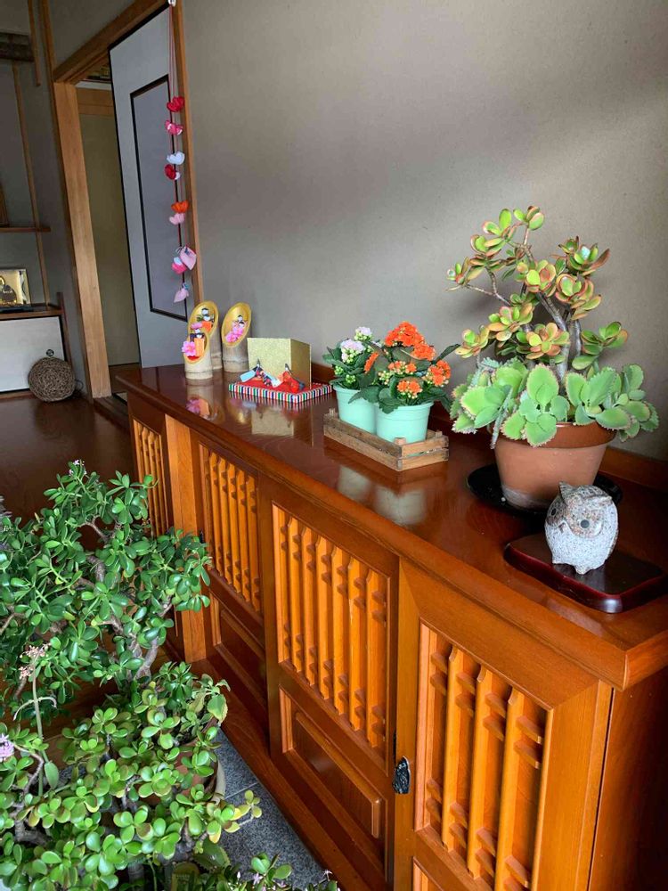 男の子2人だからお雛様がなくて、小さな物をあちこち飾っています😊
