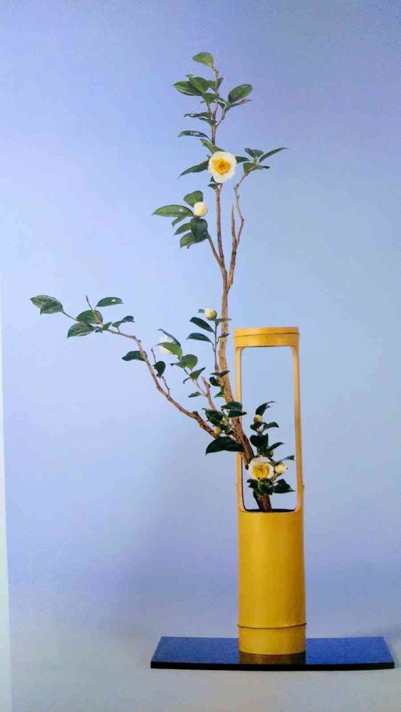 この作は、一重切花筒に、真の枝をやや前傾させて振り出し、切りだめをして立ち上げ、副を真の後ろに挿し出して前角へ振り出しています。