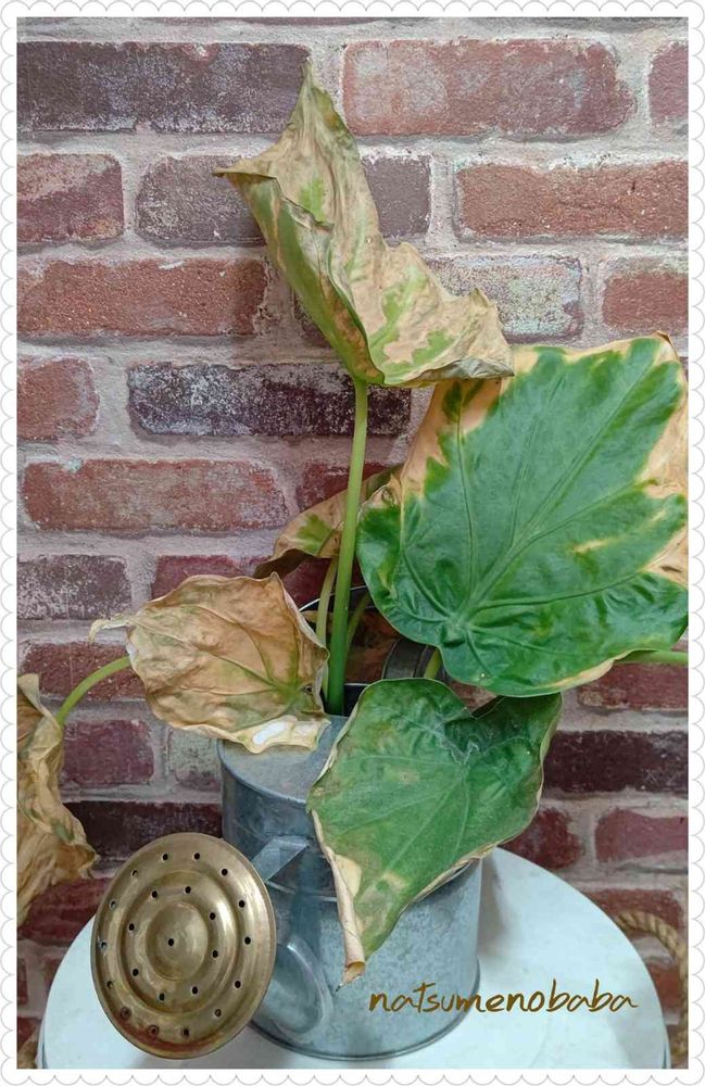 100均で購入して大きくなったクワズイモ。今は12号の鉢で、部屋に置ききれずベランダ組🙏💦💦。寒さでやられたのか?葉の周りが茶色くなった😅新芽も次々に出てるので、カット✂️