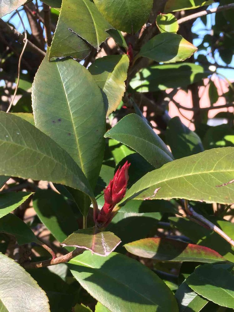 今度は目の高さ👀〜オォー葉芽も真っ赤で綺麗です❣️ 開いたら見事でしょうね🥰