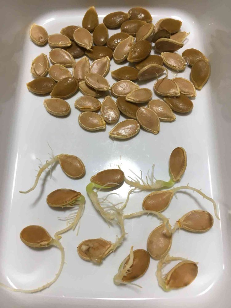 料理に使った西洋カボチャの種を捨てずにカップに入れてとってました。2-3日後数数えようと広げたら根が‼️