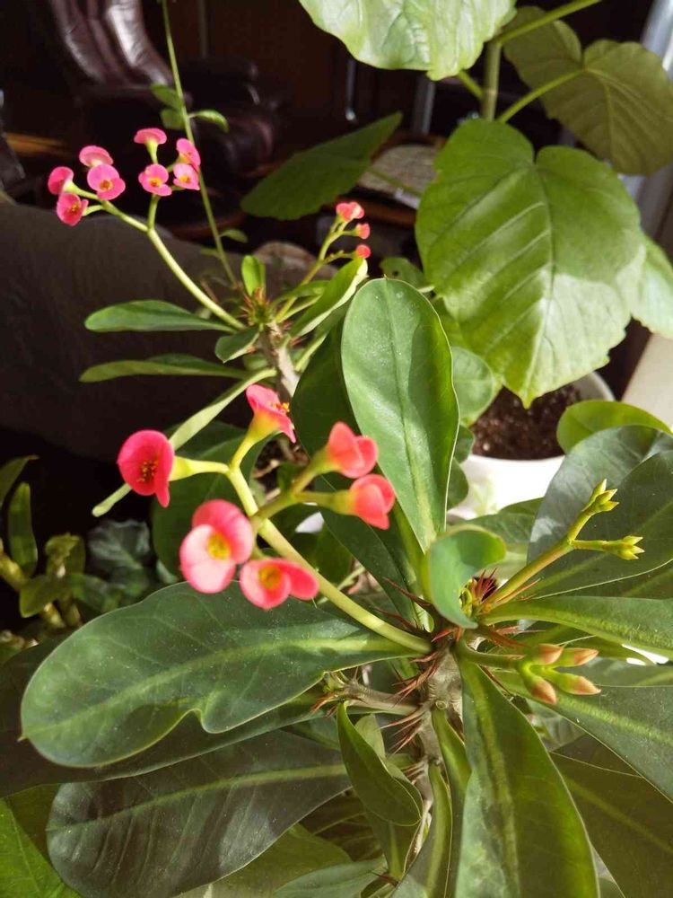 胴切りにして挿し木のハナキリン、窓辺の一等地で花盛りです💕